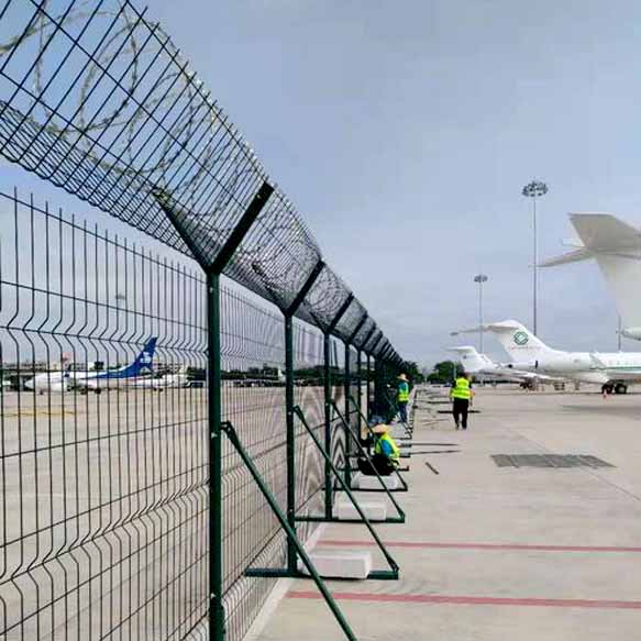 機場圍界又稱作機場隔離柵“Y型安全防御護網”,是由V型支架立柱,加強型焊接片網,安全防盜連接件和熱鍍鋅刀片刺網組成強度和安全