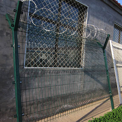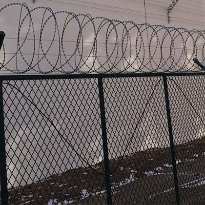 監獄監管區隔離網 監獄通透式鋼網墻又稱作“Y型安全防御護網”,該產品主要采用高強度鋼絲網片與蛇覆式刀片刺網和防盜連接件組合而