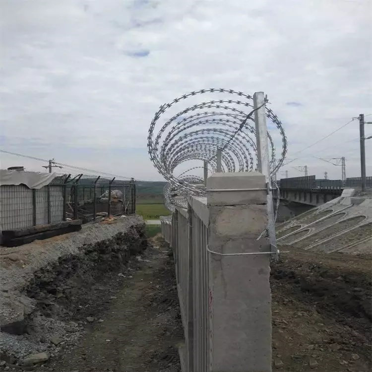 其次在高鐵刺絲滾籠安裝前一定要確認刺絲滾籠安裝基礎的牢固性,鐵路上的刺絲滾籠有的安裝在水泥立柱上,有的安裝在金屬護欄網頂部,不管是水泥立柱仍是金屬護欄網咱們一定要保證他們安裝牢固,不然容易對刺絲滾籠安裝人員形成人身損傷。在打開高鐵刺絲滾籠固定的過程中,好一個接一個地安裝,不要一次全部打開。不然,容易對對方形成損傷。固定時須牢固固定。因為刺絲籠有彈性,所以不要損傷設置者。