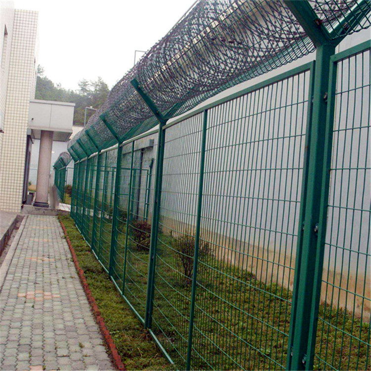 監獄看守所圍墻防護阻隔網一般都是用刀片刺網與護欄網的結合體,由V型支架立拄,加強型焊接片網,安全防盜連接件和刀片刺網組成,既安全環保又經久耐用。圍墻防護阻隔網網格結構簡練、防攀爬效果好,便于運送、安裝不受地形起伏限制,特別是對于山地、坡地、多彎地帶適應性強。