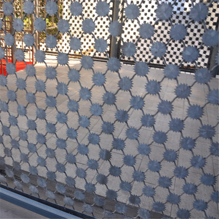 監獄太陽花刺護欄網為單層梅花刺片網,直徑不小于7.5cm,刺片厚1.5mm,選用Q235低碳鋼板沖壓成型,監獄太陽花刺護欄網網片為菱形網孔,網格尺寸:120mm*110mm(高*寬),網絲直徑8mm,選用S195線材高壓焊接,每一個焊點附焊梅花刺一個。