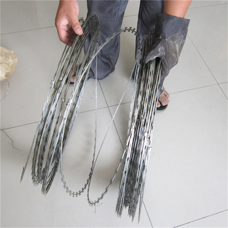 刀片刺網用途:用于草場邊界、鐵路、高速公路的隔離防護以及園林公寓,監獄,哨所,邊防等的圈禁防護。刀片刺網一般用于監獄做防護用,因刀片鋒利不易觸摸,起到一定的嚇阻作用,刀片刺繩用途比較廣泛,他可以用于居民的墻體防護,也可以用來圈地等,該刺繩防盜效果比普通刺繩要好,價格也不高,所以刀片刺繩越來越應用廣泛。