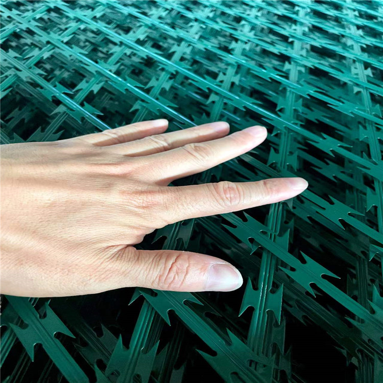 特點:焊接刀片刺網又名菱形刀刺網,是一種近年發展起來的防護、隔離能力較強的新型防護網產品。它采用鋼板沖壓成型包附于鋼絲(筋絲)之上,由銳利尖角鍍鋅鋼板或不銹鋼薄板做刀片,高張力鋼絲做芯線組合而成的。鋒利的刀型刺由雙線扣裝后成蛇腹狀,既美觀又讓人不寒而栗。起到了很好的阻嚇作用。