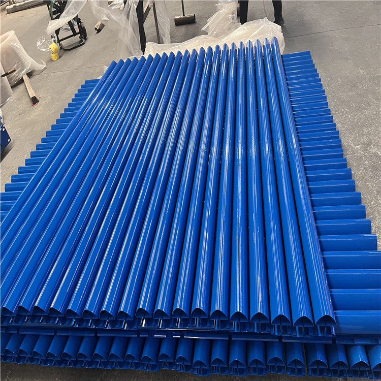 桃型柱護(hù)欄立柱的結(jié)構(gòu)描述:一般桃形立柱的板材厚度為1-1.2mm,通過機(jī)器冷壓、冷彎成型。柱體外側(cè)為橢圓型,內(nèi)側(cè)兩板相接后均各自向外彎制成U型,即為掛鉤部分。為便于桃型立柱與網(wǎng)片的連接,立柱內(nèi)側(cè)根據(jù)網(wǎng)片的網(wǎng)孔尺寸,延立柱長度方向均勻的設(shè)置N組鉤掛缺口分布于柱體兩側(cè),掛鉤U型的外部與外側(cè)的橢圓形柱體的直邊相切,有效地防止被撬開,保證了護(hù)欄的防撬安全性能。