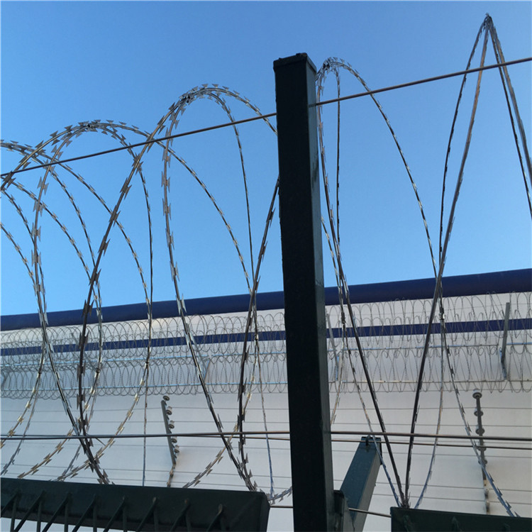 螺旋型刀片刺絲, 螺旋單一型刀片刺網(wǎng)是由一根蛇腹型刀片刺繩環(huán)繞而成,不需要使用卡子來(lái)固定,按照其展開(kāi)的自然形式進(jìn)行安裝。是刀片刺繩布置的一種,它沿墻壁或柵欄自然環(huán)繞來(lái)達(dá)到防護(hù)目的。單螺旋刀片刺繩一般使用的刀型是CBT-60和CBT65。材質(zhì):優(yōu)質(zhì)低碳鋼絲, 鍍鋅、涂塑、噴塑 。特點(diǎn):網(wǎng)身剛硬,可以安裝傳感裝置等、不必用張力絲、不需要高技術(shù)工人維護(hù)、易安裝、維護(hù)成本低。
