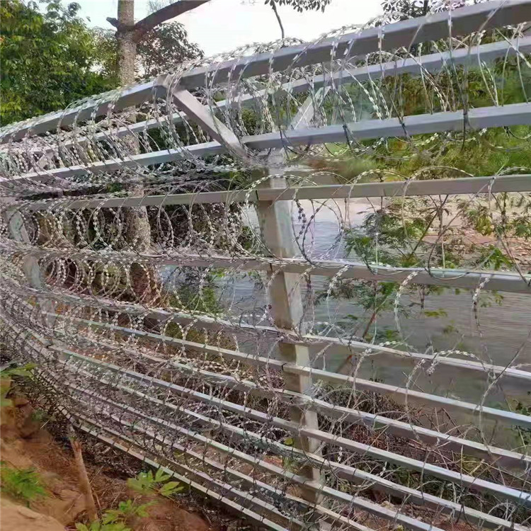 是一種近年發(fā)展起來的防護(hù)、隔離能力較強的新型防護(hù)網(wǎng)產(chǎn)品。它采用鋼板沖壓成型包附于鋼絲(筋絲)之上,由銳利尖角鍍鋅鋼板或不銹鋼薄板做刀片,高張力鋼絲做芯線組合而成的。鋒利的刀型刺由雙線扣裝后成蛇腹?fàn)睿让烙^又讓人不寒而粟。起到了很好的阻嚇作用。該產(chǎn)品具有美觀、防阻效果好、施工便利等優(yōu)點。