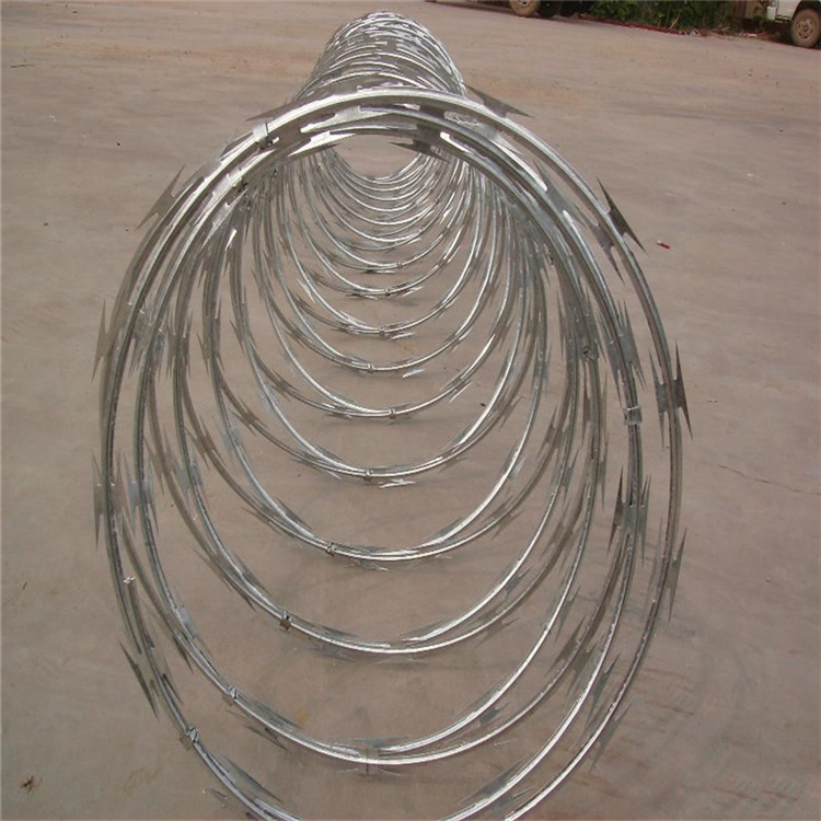刀片剌網(wǎng)是一種近年起來的防護,隔離能力比較強的防護產(chǎn)品,采用優(yōu)質(zhì)鋼片沖壓尖刺包裹高強度鋼絲壓制而成,雙線用卡扣銜接固定,呈現(xiàn)螺旋型 ,即美觀又讓人不寒而栗,起來了很好的阻嚇作用。-般監(jiān)獄用不銹鋼304的比較多,看守所有用不銹鋼304的,這樣不銹鋼的成本高,使用時間就長,普通熱鍍鋅+的上鋅量也就30-40克,機場和高鐵用的一般的就是高熱鍍鋅的,上鋅量在120克左右,這種成本低,壽命短。