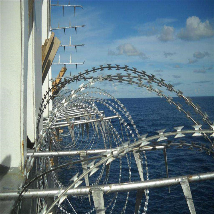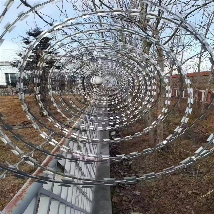 不銹鋼刀片刺繩可防盜色澤潔白發(fā)亮,鋅層厚、刀片分布均勻、刀片鋒利不易產(chǎn)品特點:生銹、牢固耐用低碳鋼絲、焊點抗拉力強、支撐力大抗拉力強、使用壽命長可廣泛用于許多學校、小區(qū)、家用、園林公寓、邊防。