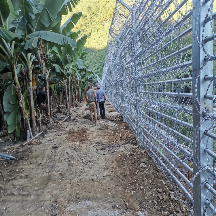 4、在看守所巡巡邏道圍墻的Y字形支架的兩邊各拉一根鋼絲,對刺網進行再固定,以免左搖右晃。 刀刺隔離網片得收放: 刀刺隔離網每2圈有3-7個卡扣,而且是圈圈相卡,拉開以后形成螺旋狀,拉伸的時候注意一定要戴防護手套,預防劃傷。