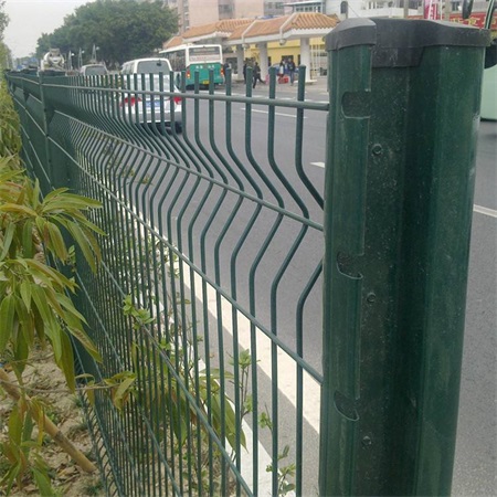 三角折彎護欄網常見規格:浸塑絲徑: 4. 0-6. 0mm網格尺寸: 50mm x180mm  60mx200mm桃型立柱尺寸: 50x70mm  70x100m厚度1- 2mm網片尺寸: 2. 5mx3.0m加強筋:三道折彎或四道折彎:結構:用高強度冷拔絲與低碳鋼絲焊接后經過液壓成型,用鏈接附件與鋼管支柱固定。