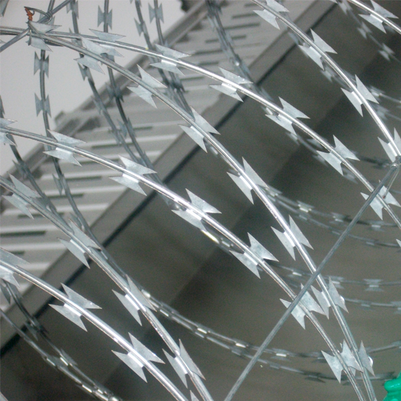 獄墻鋼網墻-通道隔離網的刀片刺網主要是由熱鍍鋅鋼板或不銹鋼薄板沖壓而成的,它擁有尖銳的刀片,高張力鍍鋅鋼絲或者不銹鋼絲做芯線組合而成的產品。由于刺網的形狀很特別,而且每個角度都有尖狀刀片,因而能達到極好的防御保護效果。