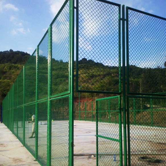 球場圍網安裝與步驟四、掛網片,球場圍網網片的固定方式分為扁鐵固定和鋼筋兩種固定方式,扁鐵固定方式是將扁鐵穿過勾花網四周,使用自攻釘先固定好上橫梁的網片,向下拉平網片,固定于下橫梁上左右同樣使用自攻釘進行固定于立柱上;鋼筋穿插掛網方式是使用鋼筋穿過勾花網固定到圓管上的U型槽的鏈接裝置中,并使用螺釘固定好,上下左右均勻展開,具有一定的彈性。