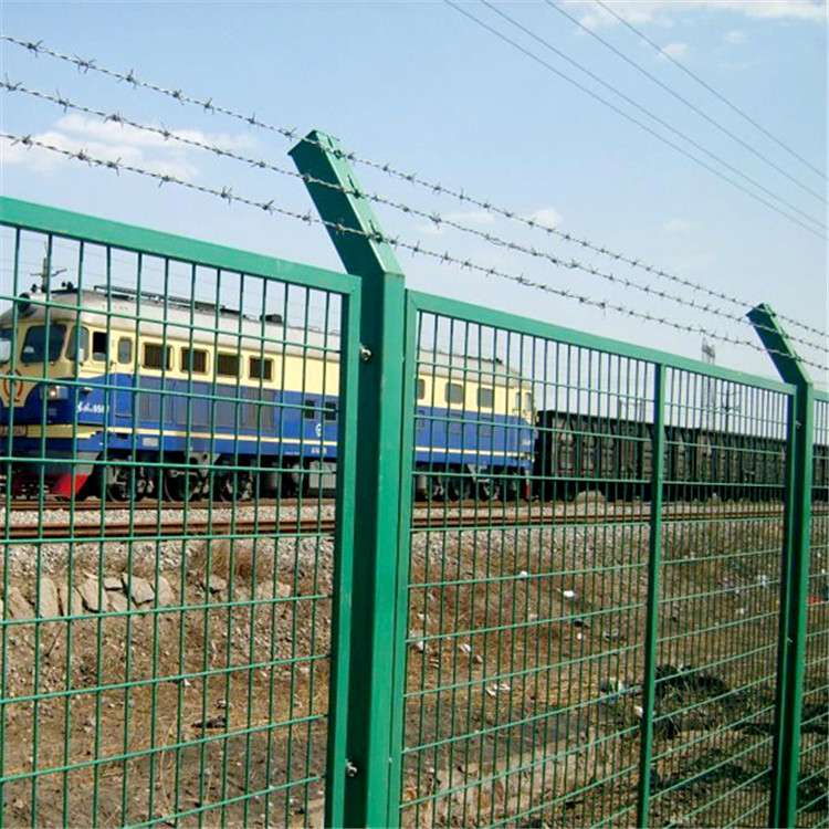 高速鐵路防護柵欄類型區分與作用說明:雙邊絲護欄,直框護欄,頂部30°折彎的護欄。一般鐵路線路兩側為了阻止落石或者阻擋外界的任何動物的時候會選擇雙邊絲護欄網作為隔離網。鐵路鐵軌兩側會使用直框護欄或者加折彎的護欄作為防護網。但是作為鐵路防護柵欄的護欄邊框不能使用普通的20*30的小邊框,而是采購30*40的方管邊框作為護欄網的邊框與低碳鋼絲焊接。或者是以鋼板網作為網片,四周焊接角鐵,也被稱為框架型的鐵路防護柵欄。安裝尺寸:1.8米*3米,柱中到柱中,鐵路線路上常采用水泥立柱與網片連接。邊框:30*40mm,或者40*40的角鐵。表面處理:浸塑草綠色或者浸塑墨綠色。